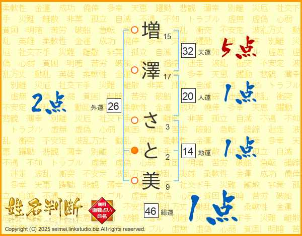 増(15画)澤(17画) さ(3画)と(2画)美(9画)