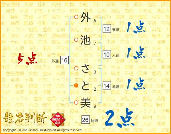 生活面を象徴する運勢です。外部から受ける影響力を表し、結婚運、家庭運や職場、環境への順応性を表します。総運から人運を引いた画数。姓や名が1文字の場合を除く。