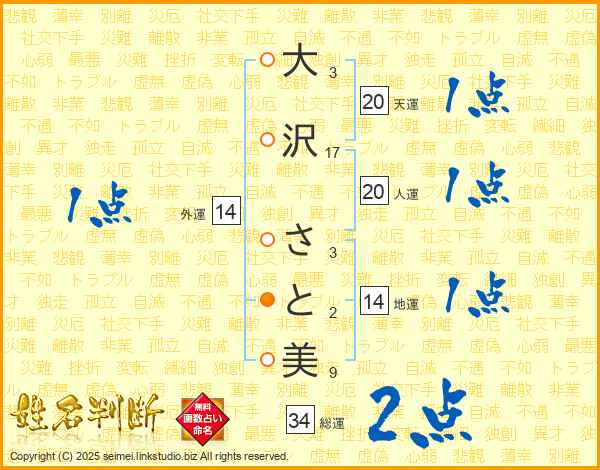 大(3画)沢(17画) さ(3画)と(2画)美(9画)