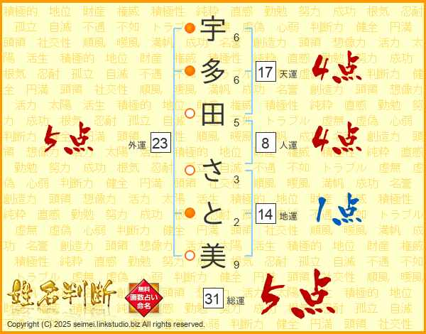 宇多田さと美さんの総運は31画の5点!