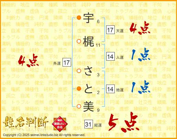 宇(6画)梶(11画) さ(3画)と(2画)美(9画)