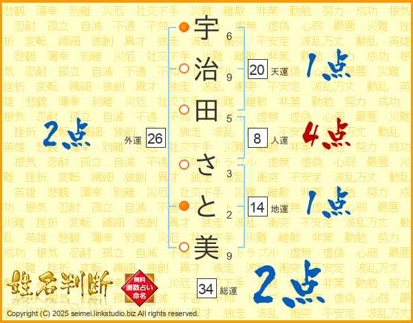 宇(6画)治(9画)田(5画) さ(3画)と(2画)美(9画)