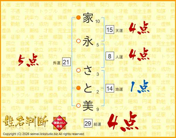 家(10画)永(5画) さ(3画)と(2画)美(9画)