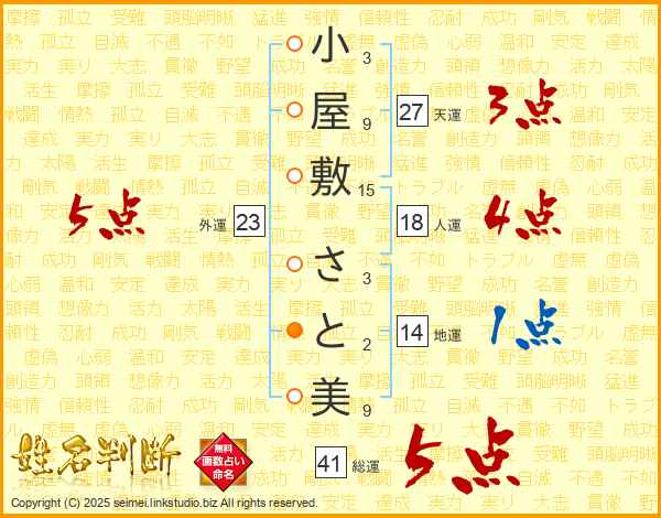 小(3画)屋(9画)敷(15画) さ(3画)と(2画)美(9画)