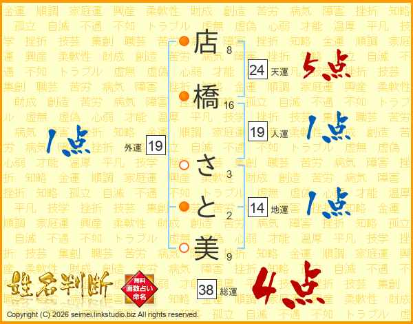 店(8画)橋(16画) さ(3画)と(2画)美(9画)