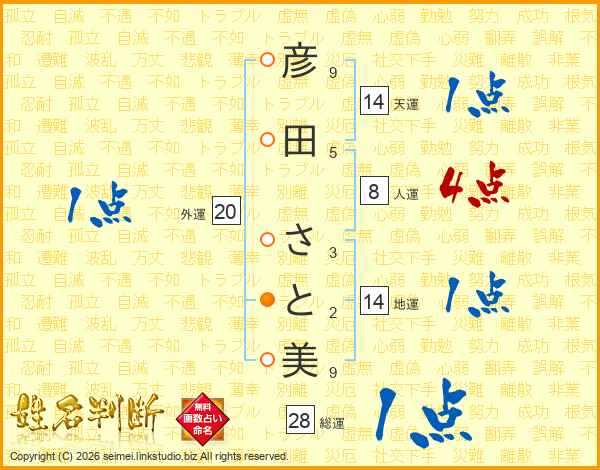 彦(9画)田(5画) さ(3画)と(2画)美(9画)