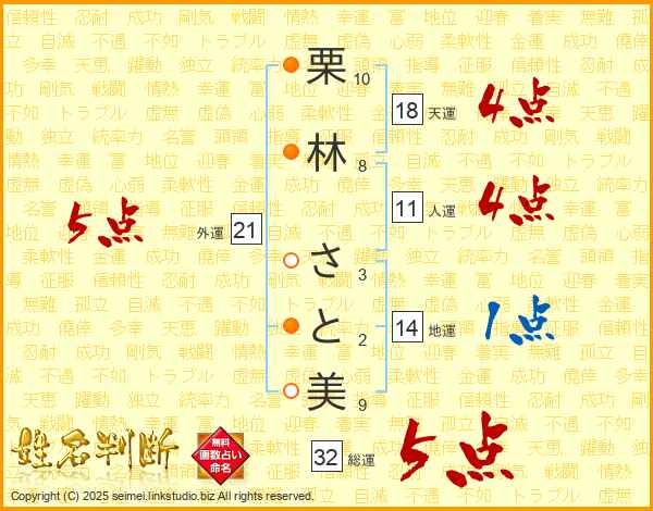生活面を象徴する運勢です。外部から受ける影響力を表し、結婚運、家庭運や職場、環境への順応性を表します。総運から人運を引いた画数。姓や名が1文字の場合を除く。