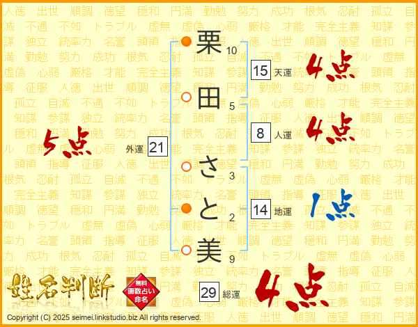 栗(10画)田(5画) さ(3画)と(2画)美(9画)
