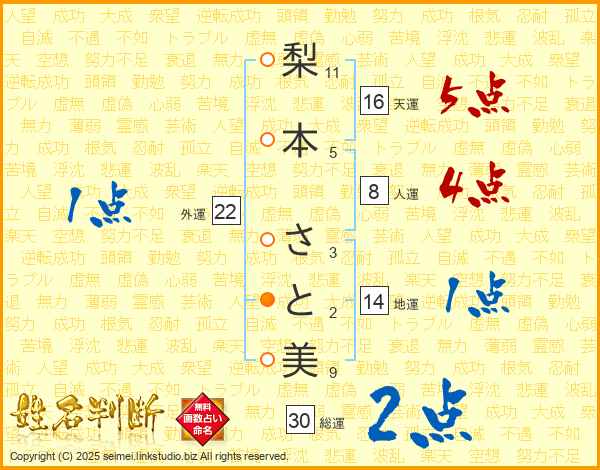 梨(11画)本(5画) さ(3画)と(2画)美(9画)