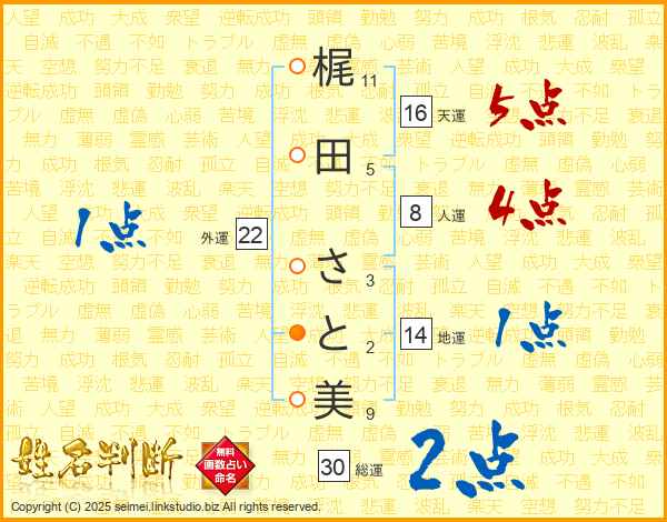 梶(11画)田(5画) さ(3画)と(2画)美(9画)