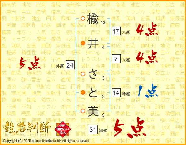 楡(13画)井(4画) さ(3画)と(2画)美(9画)