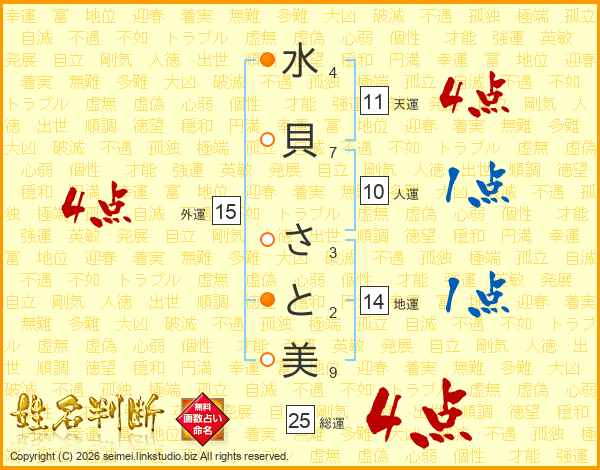 水(4画)貝(7画) さ(3画)と(2画)美(9画)
