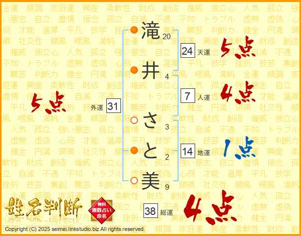 滝(20画)井(4画) さ(3画)と(2画)美(9画)