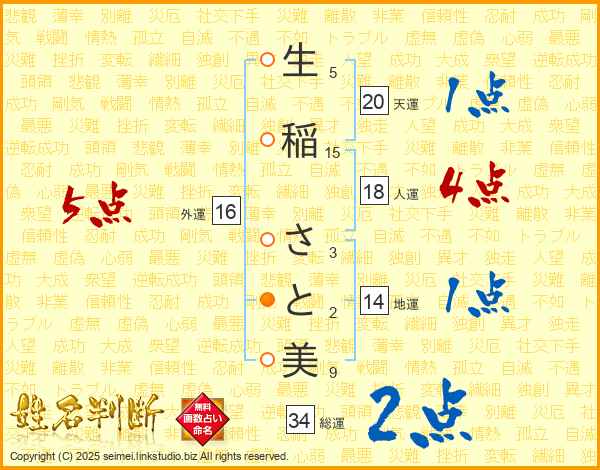 生(5画)稲(15画) さ(3画)と(2画)美(9画)