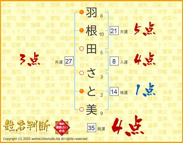 羽根田さと美さんの総運は35画の4点!