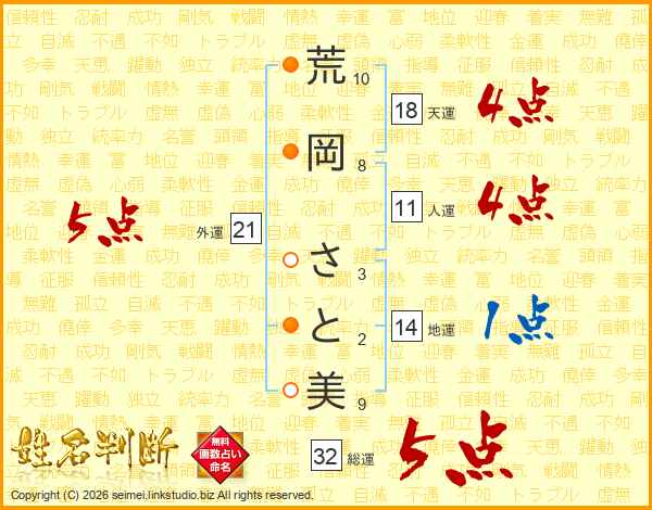 荒(10画)岡(8画) さ(3画)と(2画)美(9画)