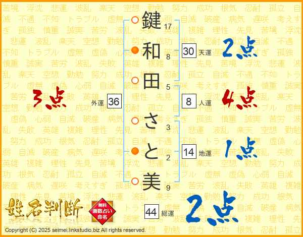 生活面を象徴する運勢です。外部から受ける影響力を表し、結婚運、家庭運や職場、環境への順応性を表します。総運から人運を引いた画数。姓や名が1文字の場合を除く。