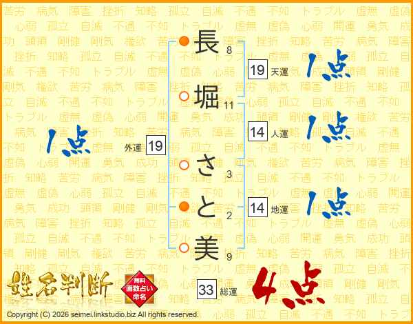 長(8画)堀(11画) さ(3画)と(2画)美(9画)