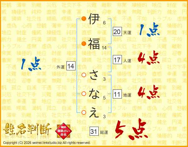 伊(6画)福(14画) さ(3画)な(5画)え(3画)
