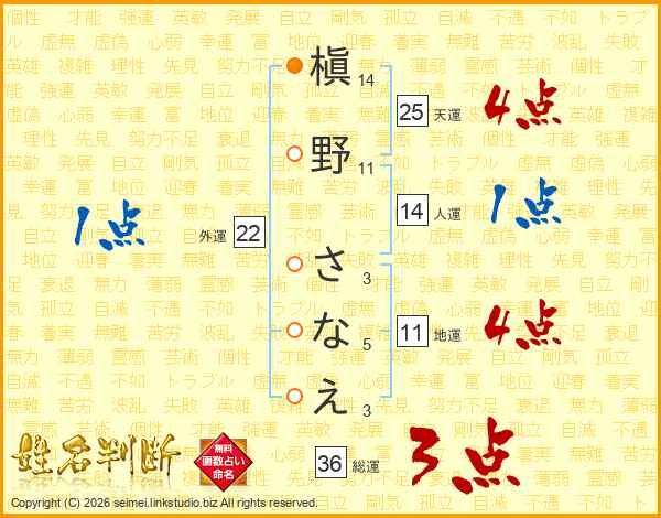 槇(14画)野(11画) さ(3画)な(5画)え(3画)