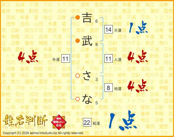 生活面を象徴する運勢です。外部から受ける影響力を表し、結婚運、家庭運や職場、環境への順応性を表します。総運から人運を引いた画数。姓や名が1文字の場合を除く。