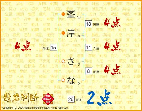 峯(10画)岸(8画) さ(3画)な(5画)