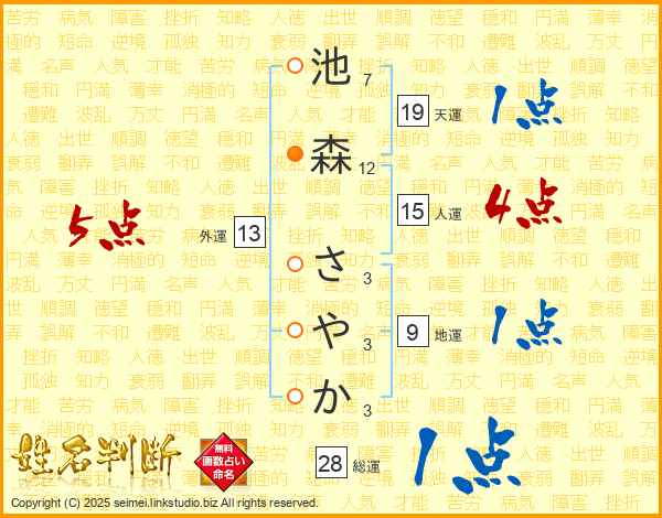 生活面を象徴する運勢です。外部から受ける影響力を表し、結婚運、家庭運や職場、環境への順応性を表します。総運から人運を引いた画数。姓や名が1文字の場合を除く。