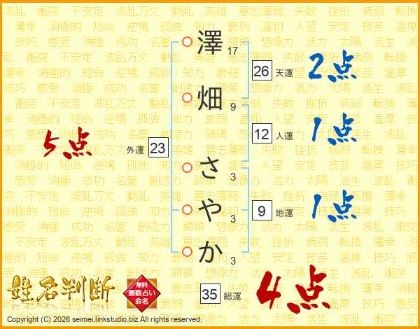 澤(17画)畑(9画) さ(3画)や(3画)か(3画)