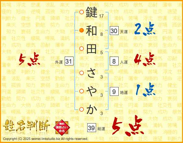 鍵和田さやかさんの総運は39画の5点!