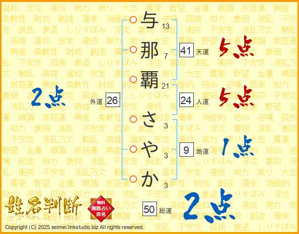 与(13画)那(7画)覇(21画) さ(3画)や(3画)か(3画)