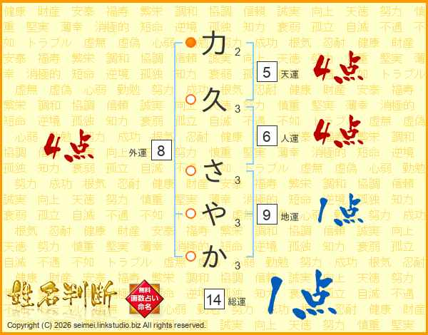 生活面を象徴する運勢です。外部から受ける影響力を表し、結婚運、家庭運や職場、環境への順応性を表します。総運から人運を引いた画数。姓や名が1文字の場合を除く。
