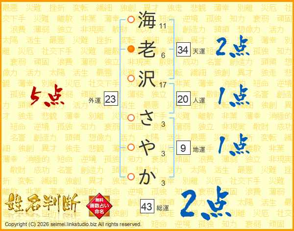 海(11画)老(6画)沢(17画) さ(3画)や(3画)か(3画)