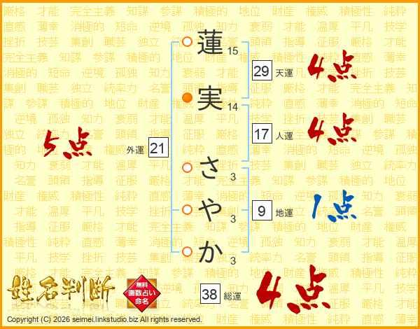 蓮(15画)実(14画) さ(3画)や(3画)か(3画)