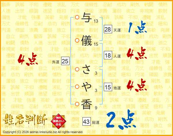 与(13画)儀(15画) さ(3画)や(3画)香(9画)
