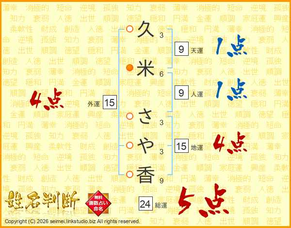 久(3画)米(6画) さ(3画)や(3画)香(9画)
