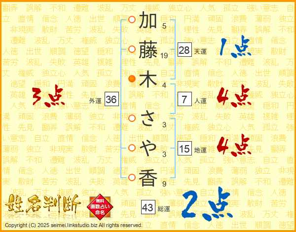 加(5画)藤(19画)木(4画) さ(3画)や(3画)香(9画)