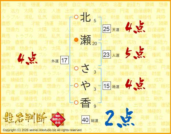 北(5画)瀬(20画) さ(3画)や(3画)香(9画)