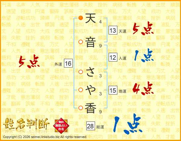 天(4画)音(9画) さ(3画)や(3画)香(9画)
