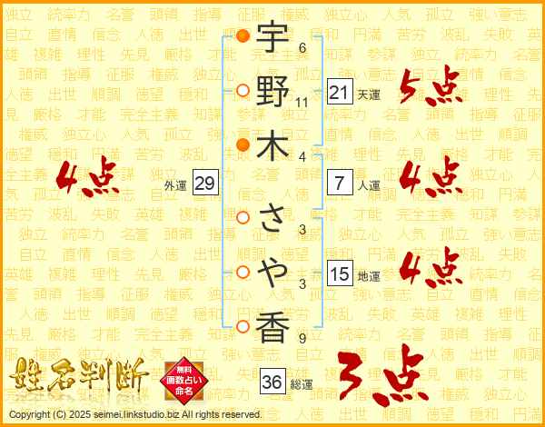 宇(6画)野(11画)木(4画) さ(3画)や(3画)香(9画)