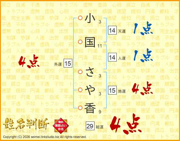 小(3画)国(11画) さ(3画)や(3画)香(9画)