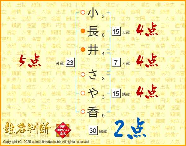 小(3画)長(8画)井(4画) さ(3画)や(3画)香(9画)