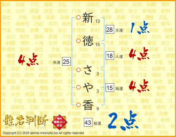 新(13画)徳(15画) さ(3画)や(3画)香(9画)