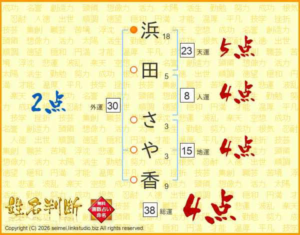 浜(18画)田(5画) さ(3画)や(3画)香(9画)