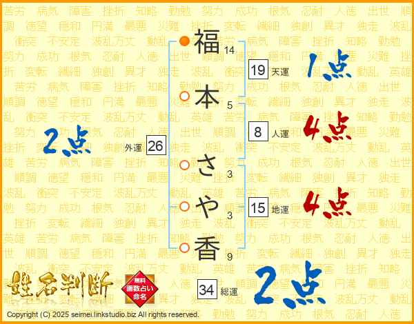 福(14画)本(5画) さ(3画)や(3画)香(9画)