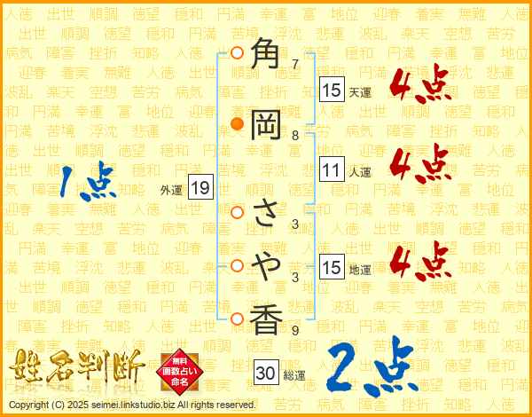 角(7画)岡(8画) さ(3画)や(3画)香(9画)