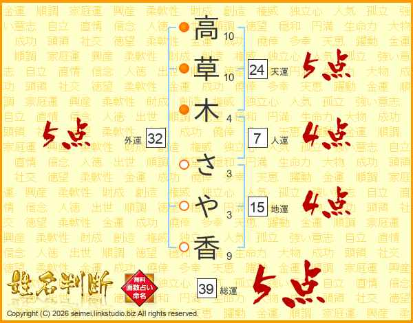 高(10画)草(10画)木(4画) さ(3画)や(3画)香(9画)