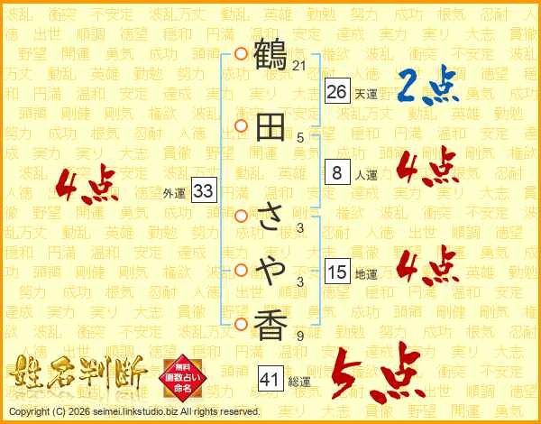 鶴田さや香さんの総運は41画の5点!