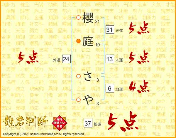 櫻(21画)庭(10画) さ(3画)や(3画)