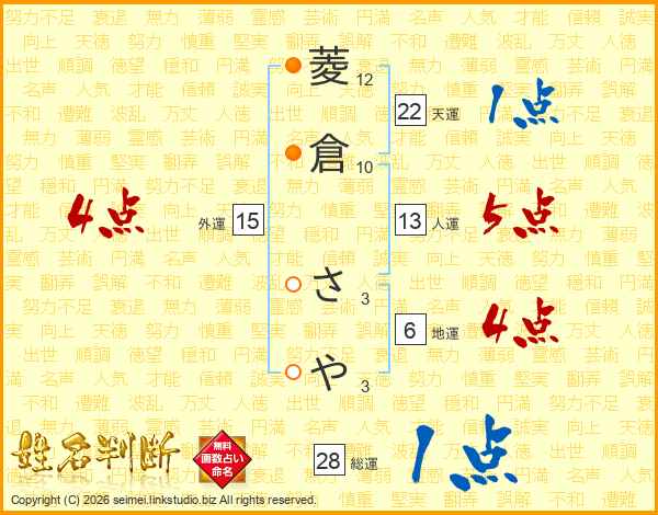 菱倉さやさんの外運は15画の4点!