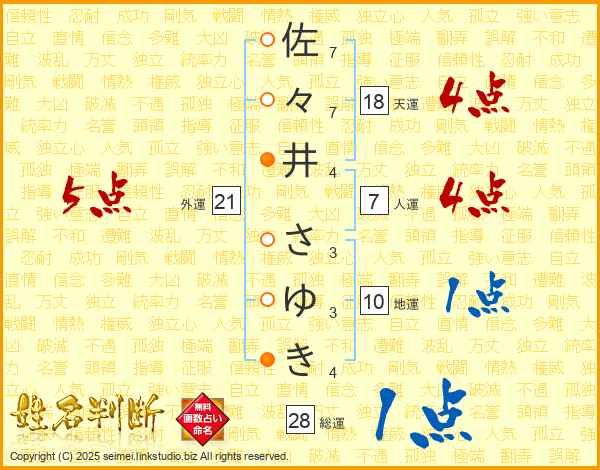 佐(7画)々(7画)井(4画) さ(3画)ゆ(3画)き(4画)